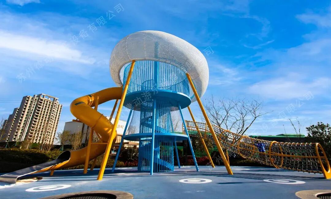 它的一只觸手是小小探險家們鍛煉攀爬的小通道,越過了阻礙便可以在它白色的傘蓋下盡情玩耍。當然,孩子們也可以從它的另一只神奇的“滑梯觸手”里直接滑到地面。