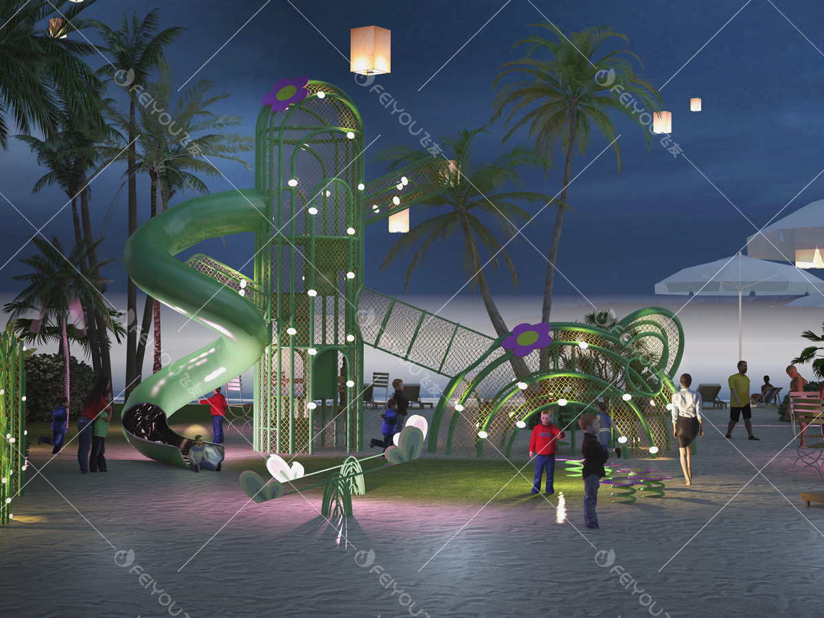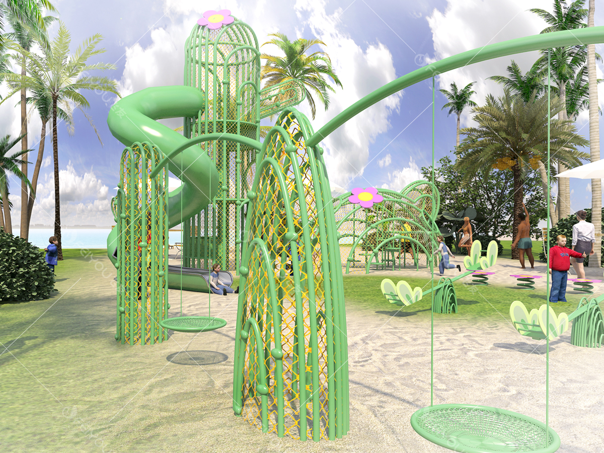 主體設(shè)施是兩座相連的仙人掌構(gòu)架,內(nèi)部有垂直爬網(wǎng),滑梯等游戲設(shè)施;場地中有仙人掌形狀的秋千,蹺蹺板,還有可愛的仙人掌小花點(diǎn)綴其間;設(shè)施立面鑲嵌了星星小燈,到夜間呈現(xiàn)出溫暖奇幻的仙人掌王國景象。